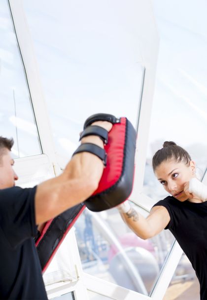 Im Fitnessbox - Kurs werden Techniken aus dem klassischen Boxen und Kickboxen ohne direkten Körperkontakt zu den Trainingspartnern vermittelt.